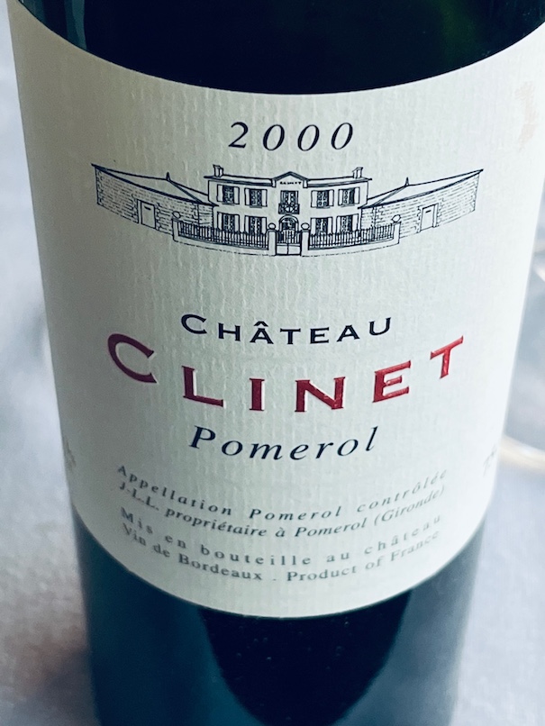 2000 CHATEAU CLINET POMEROL: Very light pale rim but an exotic stylish bouquet. Very ripe 90% Merlot (10% CS) gives a plum jam style. Taste has Asian spices and sweet raspberry notes that match well with the duck sauce. Well done. Group fav.