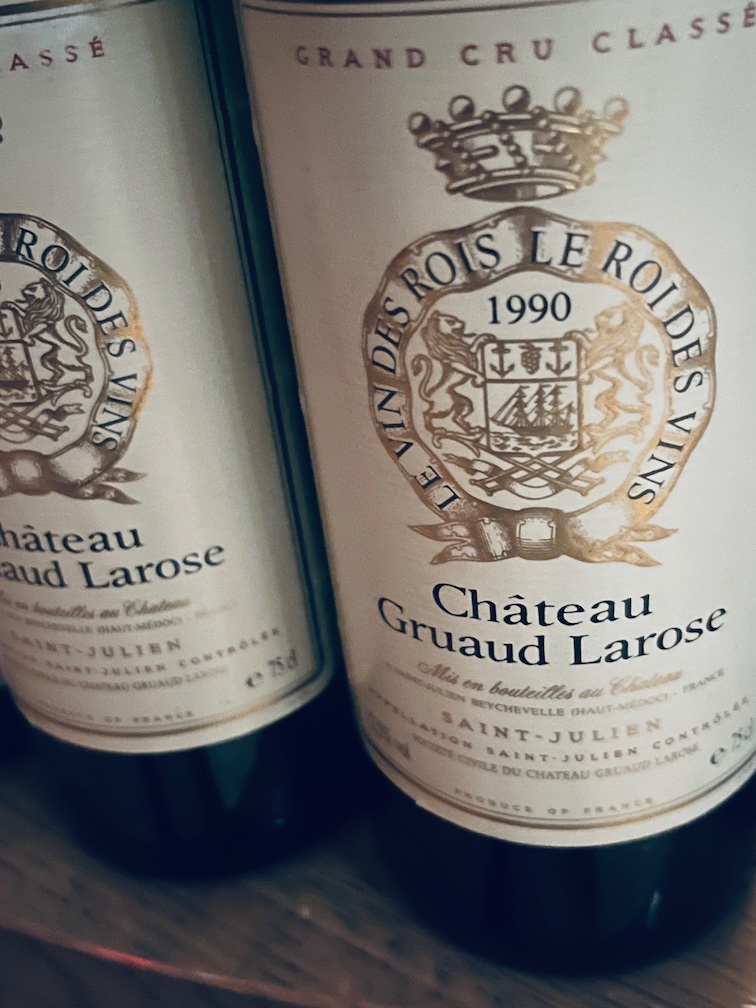 1990 CHÂTEAU GRUAUD LAROSE: Deep dark look. Full opulent softening cedar with mint textbook St. Julien from a property known for ageing ability. Developed nicely and showing clearly the best of the first flight tonight but not the group fav in this admirable flight.