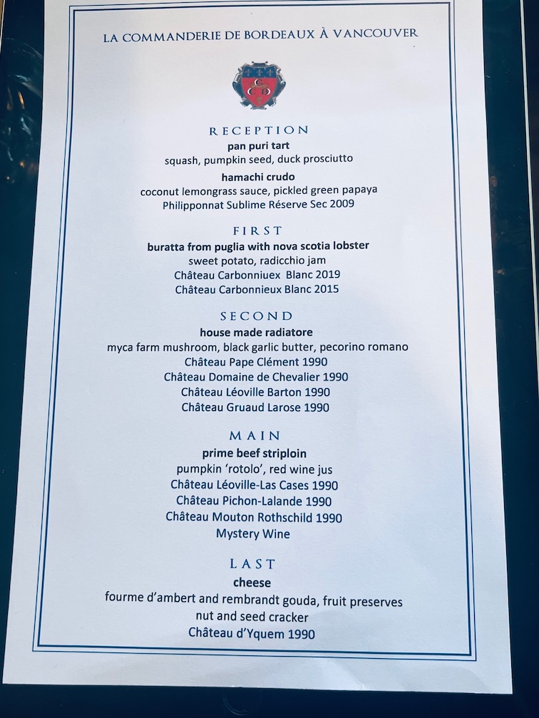 The hot dry twin Bordeaux vintages of 1990 & 1989 still elicit opinionated responses as they mature. We did a 25 year comparison of them reported on February 22, 2016 linked here. Preferably you have to go by your individual property assessments in those two vintages. Your scribe through his wine experiences prefers 1989 over 1990 for Pichon Lalande & Mouton and leans to the perfection of both Haut-Brion & La Mission Haut-Brion as well. The opposite preference of mine is for 1990 in Leoville Las Cases, Leoville Barton, Lafite, Latour, and Margaux – except that 1989 Palmer is a super star. Many properties produced excellent wines in both vintages like Montrose, Pichon Baron, and Lynch Bages. La Commanderie de Bordeaux Vancouver helpfully organized an update on October 20, 2025 at Boulevard Restaurant for a dinner featuring 1990 Left Bank red Bordeaux.