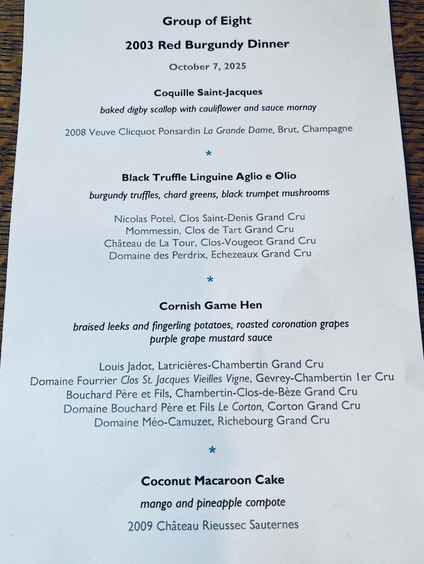 Therefore it was with anticipation that the Vancouver Group of Eight met on October 7, 2025 for Event #135 at Blue Water Cafe to assess and enjoy nine highly regarded red Burgundy properties over a wonderful dinner prepared by talented Executive Chef Frank Pabst and his brigade.