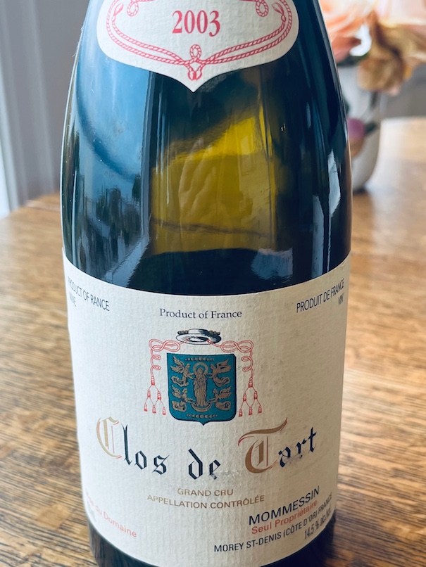 2003 CLOS DE TART GRAND CRU MOMMESSIN: A favourite property of your scribe. See previous write-ups of May 20, 2024 & December 12, 2016 linked here. Known for finesse & elegance with complex bouquet and rich balance. Very dark deep look. Evolving much better showing dense rounding fruit with nine more years of bottle age than in my 2106 note. Not the classic style of 2005, 1990, or 1985 but drinking very well at higher 14.5 abv. Ian Mottershead captured it with his comment “Don’t dismiss it by extract alone because it is a lovely wine.” Really enjoyed this wine more with the special pasta course.