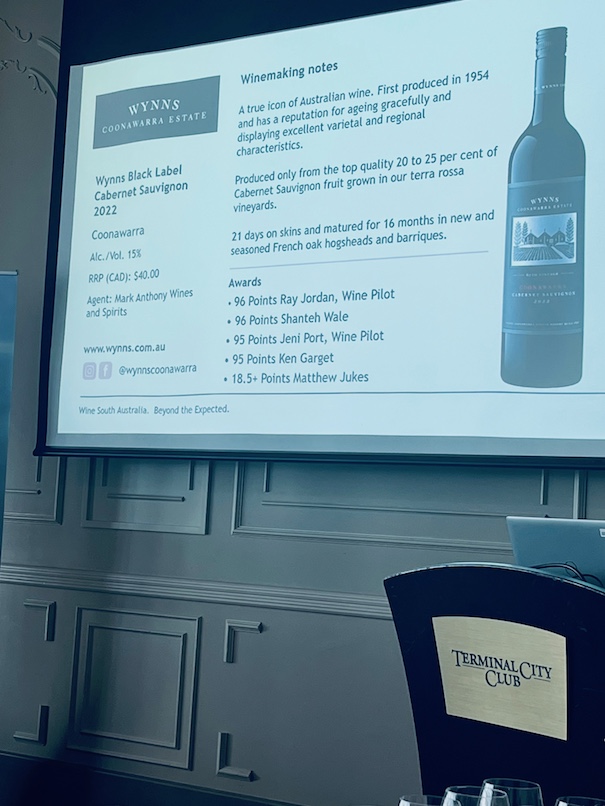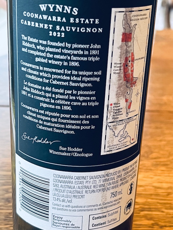 On September 24, 2025 at the Terminal City Club in Vancouver an educational Masterclass tasting was held by Wine South Australia showing “Beyond the Expected”. Some interesting wines tasted among the highlights being a lighter fragrant 2021 ASHTON HILLS Pinot Noir from Piccadilly Valley in the Adelaide Hills using 6% whole bunch with indigenous yeasts and basket pressed into French oak casks & puncheons. Also at the following reception a classy well made 2021 Chardonnay PIccadilly Chardonnay at good value from Ashton Hills shone very brightly indeed. One of the profiled wines at the Masterclass was 2022 WYNNS COONAWARRA ESTATE BLACK LABEL CABERNET SAUVIGNON – THE 67TH VINTAGE. An excellent slide presentation with details on each wine was shown to the audience and the Wynns one is posted with this Blog. It noted that the wine was “Produced only from the top quality 20 to 25 percent of Cabernet Sauvignon fruit grown in our terra rossa vineyards. 21 days on skins and matured for 16 months in new and seasoned French oak hogsheads and barriques.” It showed the retail price of $40 and the alcohol level posted at 15%. Your scribe tasted the wine and remembered my discussions with Sue that even in a warming climate she would be trying her best to keep the abv below 14. It didn’t finish with heat or alcohol that showed more on my palate with the 2022 MOLLYDOOKER WINES GIGGLEPOT CABERNET SAUVIGNON FROM MCLAREN VALE $65 at 15 abv. Your intrepid bold taster questioned the speakers that he did not believe the Wynns Cab alcohol was properly noted at 15 abv. They scrambled to the empty bottles and surprisingly to them noted 13.4 abv – not 15. Check the back label shown below. It has useful information such as “Estate was founded by pioneer John Riddoch, who planted vineyards in 1891 and completed the estate’s famous triple gabled winery in 1896.” They no longer in 2022 give the information provided on earlier vintage bottles that “Coonawarra is renowned for its unique soil and climate which provides ideal ripening conditions for Cabernet Sauvignon. Supple cloaking tannins frame all the elements to create a focused, elegant and classic “Black Label” Cabernet Sauvignon which will once again provide a benchmark for this remarkable region.” Words missing now on the back label but still so true!.
