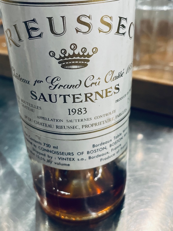 We started with the always dependable family house of POL ROGER CHAMPAGNE VINTAGE BRUT 2009 with a rich ripe full flavoured year less structured than 2008 but drinking deliciously at the moment. Wonderful with smoked Lingcod starter hors d’oeuvre. We finished with the usual very dark reddening colour at 40+ years of 1983 CHATEAU RIEUSSEC SAUTERNES showing drier crème brûlée mellowness a delightful treat plus blind another younger golden look that turned out to be 2007 CHATEAU DOISY DAENE BARSAC from Denis Dubourdieu fresh surprisingly full sweet honey peach figgy compote at 14 abv. The main event: