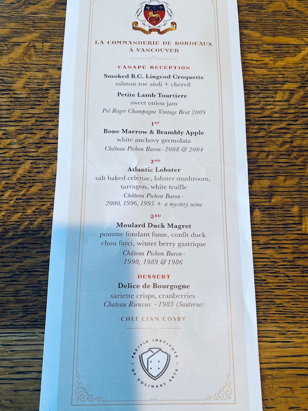 Lucky me with enthusiastic admiration this past year for many tasting opportunities of both Second Growth Pichons (see Comtesse de Lalande references here December 9, 2024) and now a second vertical follow-up of Pichon Baron to the earlier one linked here on April 14, 2025. More recently your scribe has been impressed with the always consistent 2000 Bordeaux vintage comparing two excellent ones of Pichon Baron & Fifth Growth Pontet-Canet plus last week three 1990s where Pichon Baron clearly showed its class holding its own in the tough company of Montrose & Lafite. 2003 drinking superbly now. Last night December 1, 2025 at Pacific Institute of Culinary Arts a special menu orchestrated by talented Chef Lian Cosby and brigade featuring 8 vintages of Pichon Baron. Interestingly 6 vintages were the same as in the April vertical so comparisons were in order. Last time the 1989 vintage was a clear winner followed by 1990 but this time it was a tighter contest with 1989, 1990, 2000, and bottle variable 1986 all receiving voting support. Let’s take a closer look: