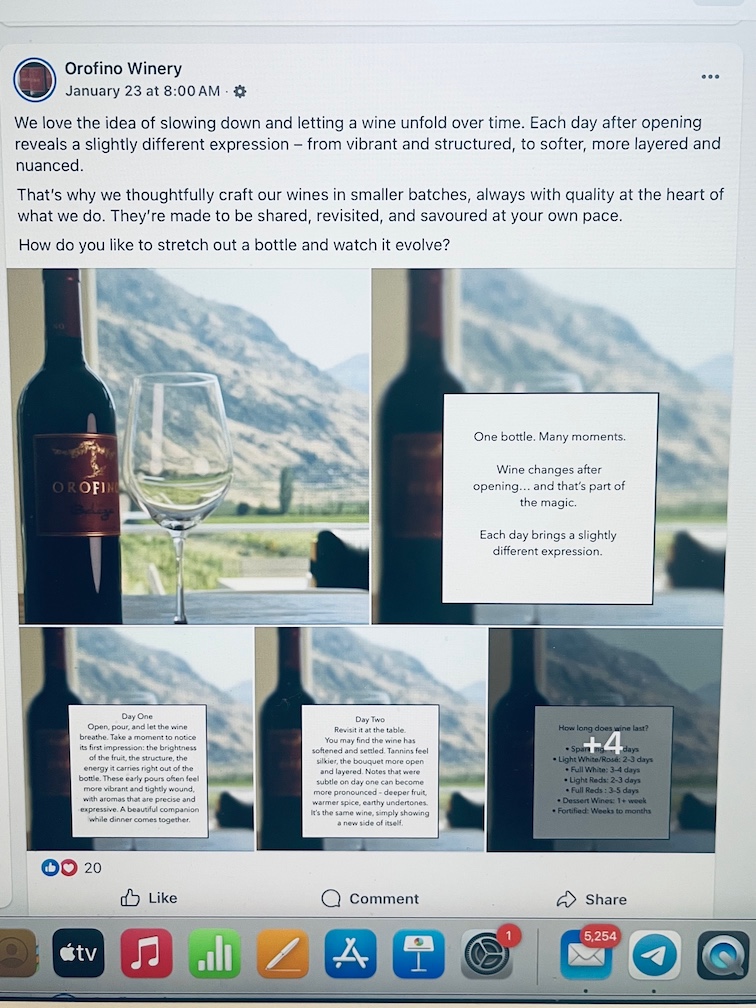 Answer: Yes. You might decant wines to help them get faster airing and open up more quickly – as well as to avoid sediment. Similarly the next day the wine may not be as fresh and vibrant as it showed when you initially opened the bottle but can show improvement with more oxygen exposure as it evolves and softens. Red wines especially can show easier tannins the next day but your scribe has noticed this development as well with white Burgundy including Chablis and other younger whites. Young wines with potential for longer aging are perfect candidates for this. Personal taste is a big factor. A recent posting by the quality winery Orofino Vineyards.com in the Similkameen Valley of British Columbia explains this experience very well. See their detailed explanations below: