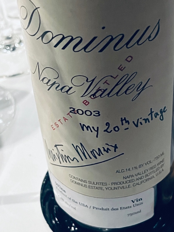 2003 DOMINUS: 88CS/7CF/5PV harvested October 3 to November 2 (longest hang time) for 5600 cases. 7 days over 100F but a great weather October ripening month. Special note on the bottle celebrating their 20th year. Probably the most open fragrant vintage tried tonight. Beautiful raspberry black tea fruit with violets are impressive. On a delicious plateau paired with Wagyu beef accompaniment.