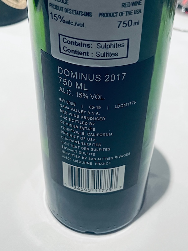 2017 DOMINUS: 88% Cab Sauv/7 Cab Franc/5 Petit Verdot harvest commenced September 21 for small crop of 2800 cases at 15 abv. Hot year with 112F on September 1. Rich concentration with structured power but more refined softer minty plummy Cabs than expected. Nose & flavour not as “Bordeaux” as Dominus showed in the earlier vertical that had more cassis, younger vines and less alcohol. Nick Wright commented on the “great eucalyptus nose”.