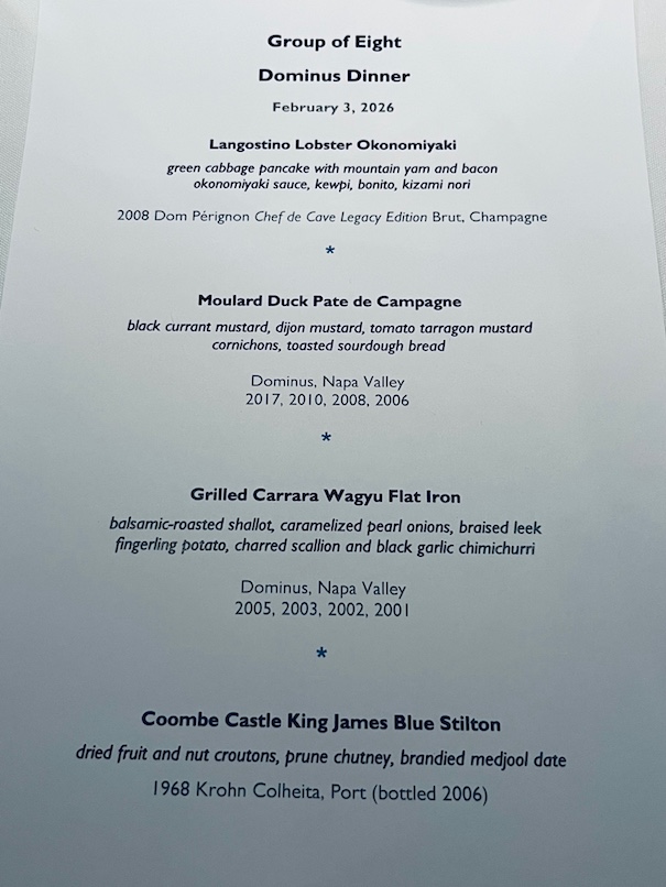 We have been studying Dominus since the beginning here in Vancouver thanks mainly to the wine collecting skills and generous sharing by Ian Mottershead. He organized at his home on February 3, 2010 an 8 vintage double blind vertical of Dominus from 1992 to 2002 with 1997 & 1999 shining brightest but all seeming more like a St Estephe Cos d’ Estournel. Fifteen years later on February 3, 2026 Ian organized another 8 vintages vertical (not blind) of Dominus for the Group of Eight #139 at Blue Water Cafe from 2017 back to 2001. Interestingly the two youngest wines last time of 2001 & 2002 were the oldest pair this time. The evening started off beautifully with an exquisite Langostino Lobster course paired with 2008 DOM PÉRIGNON CHAMPAGNE Chef de Cave Legacy Edition Brut “celebrating the continuum from Richard Geoffrey, DP Chef de Cave for 28 years to his successor Vincent Chaperon. A shared vision of an exceptional vintage – long been restrained, but now finally appears, and is completely coherent. Its slender, minimalist, and athletic character now also expresses itself with warmth. The fruit is pronounced and clear. Its aromatic persistence is remarkably intense.” We found it had explosive tiny bubbles, fresh & vibrant though still young with lots of balancing acidity admired now but with a very bright aging future. We finished with 1968 KROHN PORTO COLHEITA Bottled in 2006 combining 36 years in wood as a tawny style plus 20 years in bottle like a vintage. Much fresher than expected with stylish dried fruits and charming hazelnut cardamom toffee.