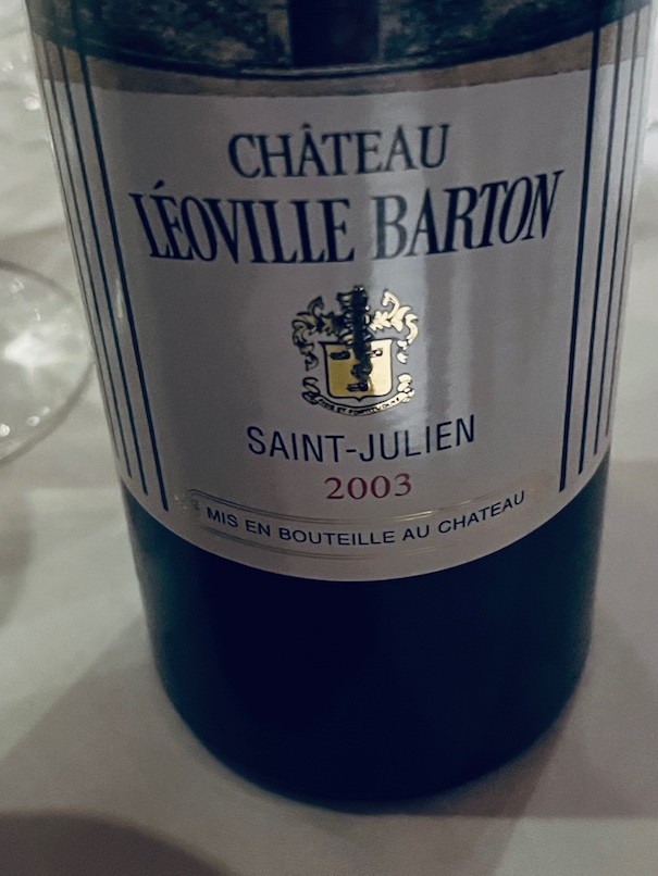 2003 CHATEAU LEOVILLE BARTON SAINT-JULIEN: Hot year of 74CS/23M/3CF harvested September 11-22 using 70% new oak. Lovely drinking now but much lighter than the October 2025 bottle. It doesn’t seem as big, ripe, or youthful here. Nick Wright found “a sweet spot drinking well.” Great with the unique 80% dark chocolate sauce on the Elk course.