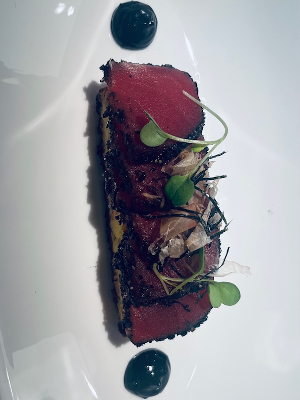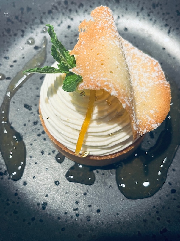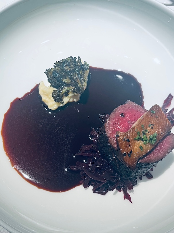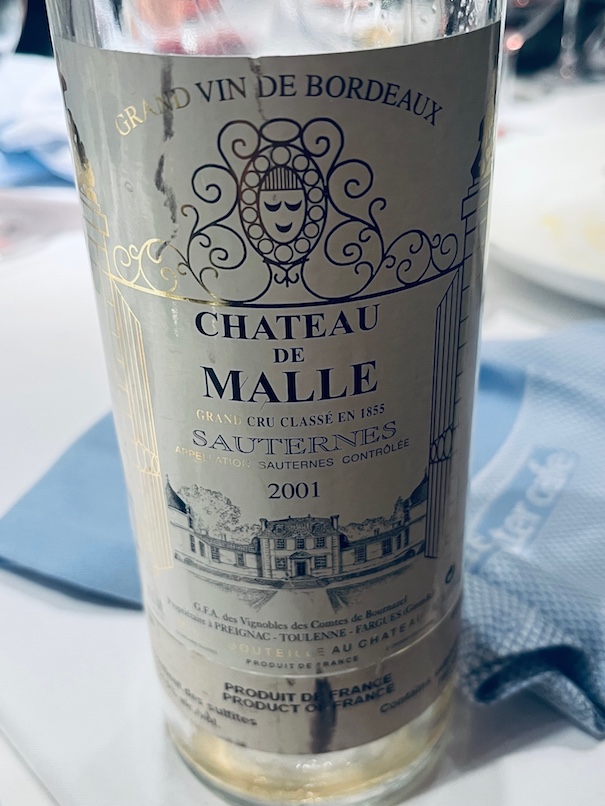 Some excellent hors d’oeuvre of sweet Dungeness crab, swordfish gyoza and fresh briny Kusshi oysters paired well with the aperitif: 2012 CHARLES HEIDSIECK VINTAGE BRUT, composed of 60% Pinot Noir & 40% Chardonnay disgorged in 2021 after 8+ years on the lees. Admired the fresh crisply balanced yet creamy and toasty concentration of these bubbles. It has rich flavours and is drinking beautifully now, but it should easily remain on this beautiful plateau of enjoyment for at least another 10+ years. We finished with two Sauternes from the exceptional 2001 vintage showing distinctively different stylings. CHATEAU RIEUSSEC 2001 has deep gold rich full noble rot botrytis with intense complex concentration compared to the lighter, clean, elegant, forward CHATEAU DE MALLE 2001 bonus treat. Both matched the dessert’s notes of orange, almond, citrus, and pineapple.
