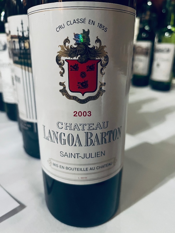 2003 CHATEAU LANGOA BARTON SAINT-JULIEN: Served double blind as a MYSTERY wine. There were many guesses, ranging from 2010 vintage to Chateau Leoville Poyferre but it seemed lighter, softer, older and mature. Not surprising really as this blend is ripe and forward, with the least 57CS/most 34M/most 9CF. Fun experience.