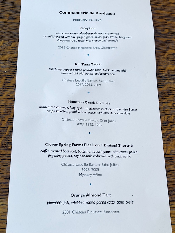 Chateau Leoville Barton Saint-Julien is a popular red Bordeaux that has consistently offered excellent quality for its price over the years. Accordingly, many of us here in British Columbia have collected and admired it. Different vintages of this wine have been referenced many times on this Blog including a recent vertical tasting by our Group of Eight on September 23, 2025, which was posted here on October 7. A second vertical of Chateau Leoville Barton was held by the Vancouver Commanderie de Bordeaux at Blue Water Cafe on February 10, 2026, featuring different vintages, but including three identical ones: 2003, 1995, and 1982. All the wines for the first tasting came from the same local source acquired on initial release and kept unmoved in cool storage. In contrast, the wines for the second tasting were recently sourced from warmer locations, assembled, and then moved to Vancouver. The difference was clearly noticeable to your scribe: the first tasting trio was darker, deeper, and slower aging than the second trio, which was more open approachable and mature – actually a good thing. Interestingly, the 1982 vintage showed better this time. Unfortunately one of my favs the classic 2000 was not present at either vertical. The first tasting had only one bottle of each vintage, and the second had three. All bottles were sound, though they varied. This just shows the inevitable bottle variation that always exists when consuming older wines. Be open-minded about how your old bottle is actually showing at this specific point.