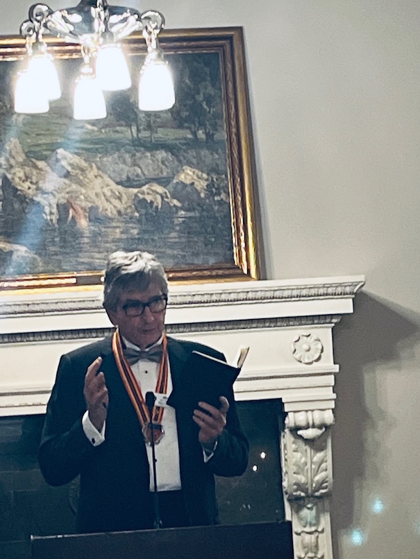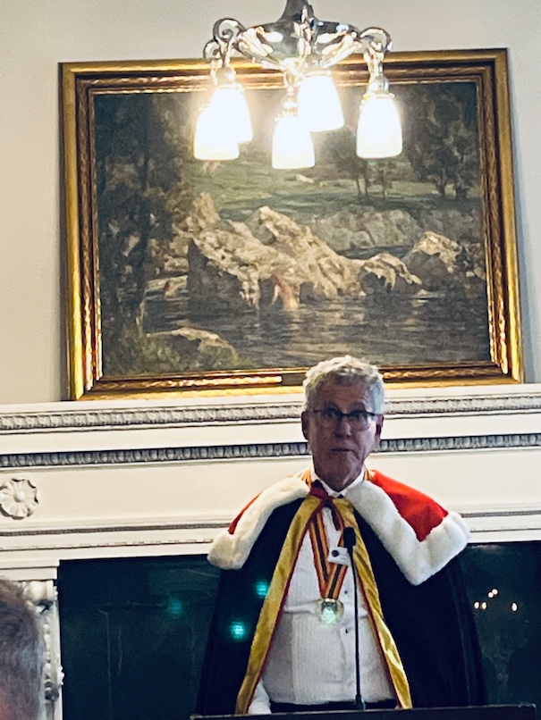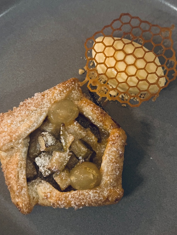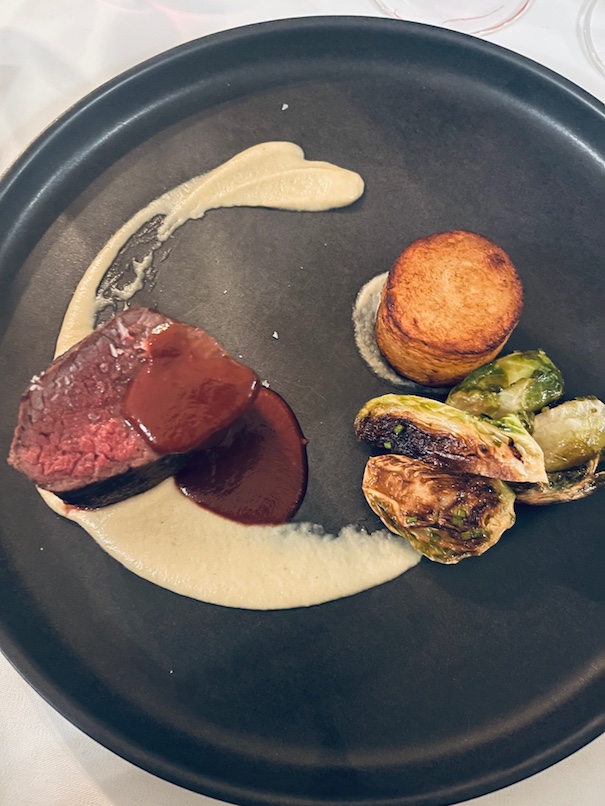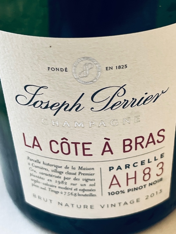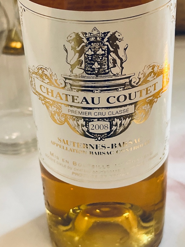 This black tie affair started with 2013 Joseph Perrier La Côte à Bras Brut Nature Vintage Champagne from a six generation House in Chalons-en-Champagne, founded in 1825. Since 2007 they have focused on this single, south-facing vineyard in Cumières, which has clay-limestone soil: 100% Pinot Noir planted in 1982 in Parcel A H 83. The 2013 vintage, which arrived mainly in October, favoured the Chardonnay grape but this production of 7568 bottles of Pinot Noir shows well. With zero dosage and long aging on the lees, it displays peachy salty fruit plus citrus & orange acidity—all interesting combinations. The dessert wine was 2008 Chateau Coutet (derived from the Gascon word for “knife”) from Barsac, 14% ABV, with freshness & subtle minerality paired appropriately with the pear tart.